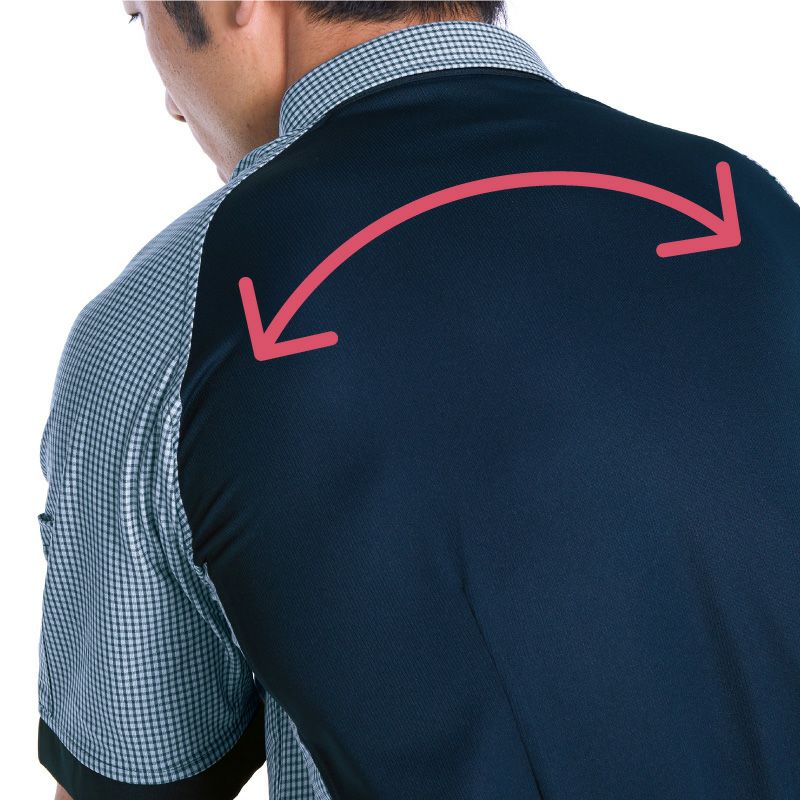超軽量ニットシャツ。高通気エアーニットを使用し、ストレッチ性と通気性抜群。脇袖一体仕様でつっぱり感が無く、腕が上げやすく、動いてもはみ出しにくい。