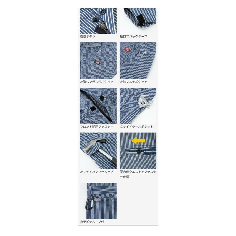 - コーコス信岡【CO-COS】 [通年] Dickies ライト ストレッチ ヒッコリーツナギ D-7106