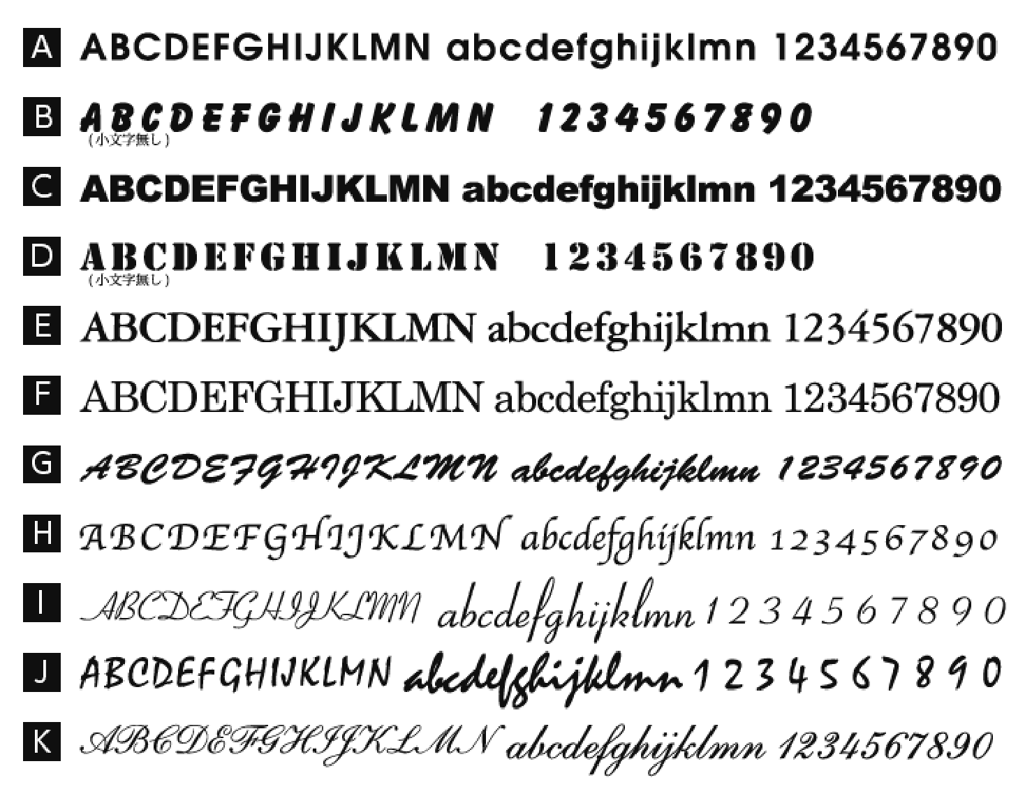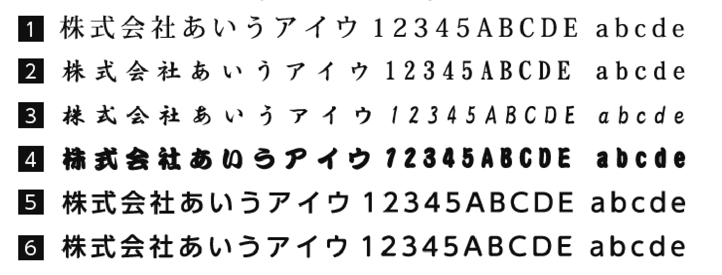 文字をプリントしたい時、字体(フォント)をこちらに掲載している字体から選んでいただくコースです。